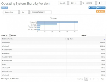 不過,Windows 7作為一款已經問世十年的操作系統,用戶基數依舊龐大。據市場調查機構Netmarketshare發布的報告顯示,2019年12月,Windows 10系統市場份額占比達到54.62%,而Windows 7位居第二,為26.64%。